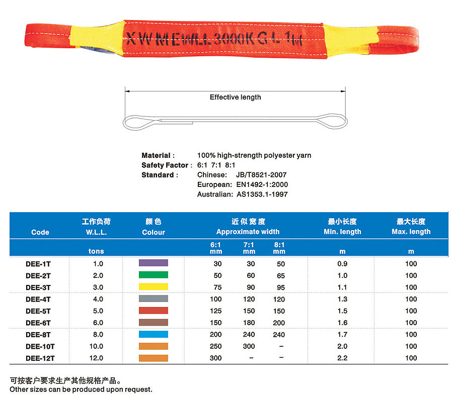 Synthetic fabric lifting belt (hereinafter refers to lifting belt) is a kind of soft lifting belt made of non-metallic materials and successor production of wire rope and chain in the lifting industry which is lighter and more convenient than similar metal and can solve the difficult problems such as large tonnage but small lifting space in the lifting process. The lifting belt is light, convenient and durable. Additionally, it has a noticeable earthquake effect, non-conductive performance, anti-corrosion and protects hanging items from being scratched. Many fracture experiments proved that lifting belt almost inflict zero reverse damage to metallic rope chain. The lifting belt adopts international standard colors to distinguish carrying tonnage. In the application process, carry tonnage can be distinguished by lifting belt jacket color if label on lifting belt wears Synthetic fabric lifting belt was used worldwide in the early days and has an application history spanning over fifty years. After being popularized in China for more than twenty years, it has gradually replaced wire rope rigging and chain rigging in many industries.