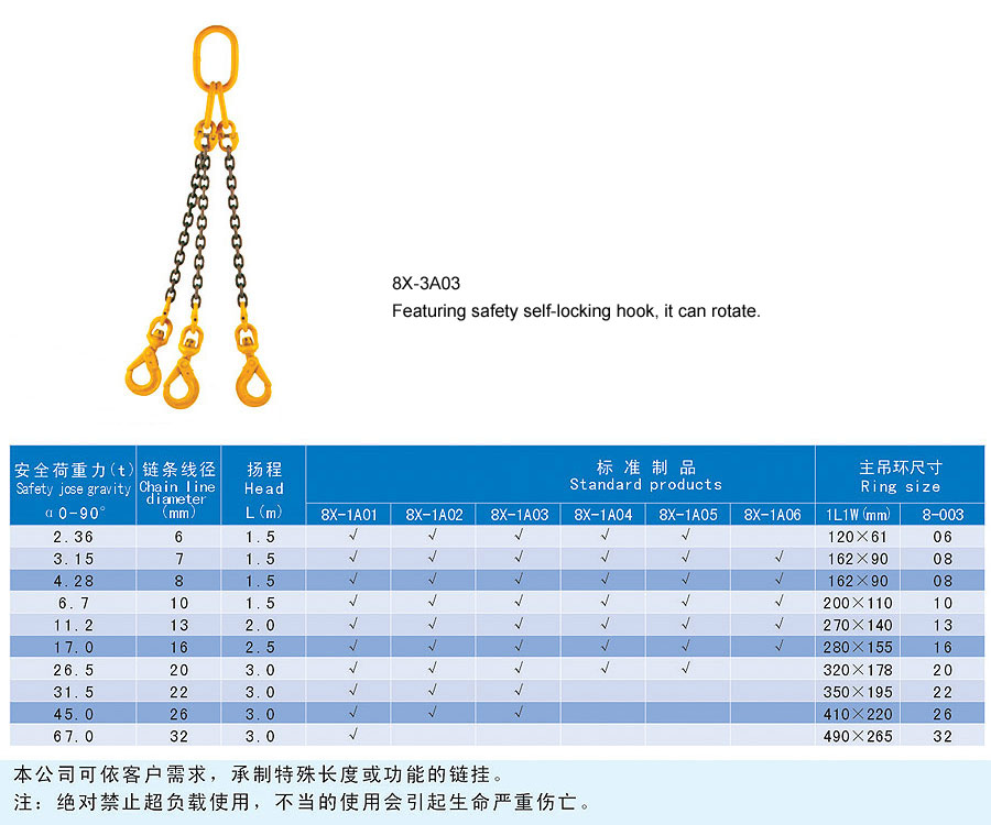 Chain rigging is a kind of rigging formed by connecting metallic chain links, which is divided into two categories in form, namely welding type and assembling type and falls into single foot and multi-feet in structure. The chain rigging is made of high quality alloy steel, boasts wear resistance, high strength, durability and flexibility and is suitable for large scale and frequent usage. Additionally, it is anti-radiation and high temperature(-40~200℃) and is suitable for lifting hot steel billet and steel coil. The flexible multiple feet and various combinations can improve efficiency and cut cost. The company offers general types of ship store, accessories and marine spare supply and technical services and it aims to provide best products and services for our customers.