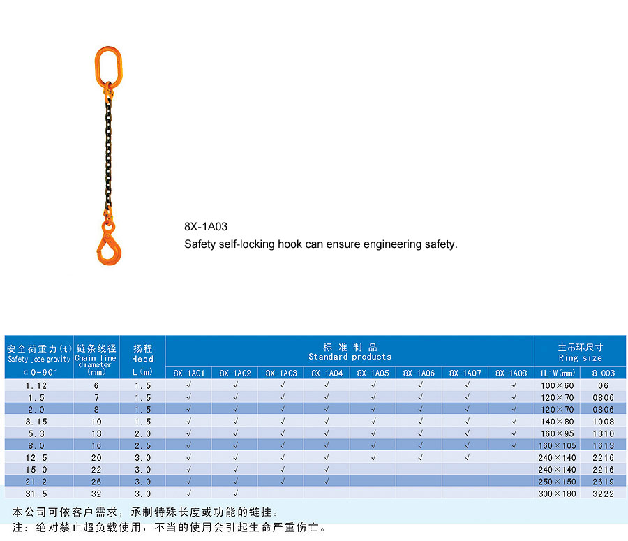Chain rigging is a kind of rigging formed by connecting metallic chain links, which is divided into two categories in form, namely welding type and assembling type and falls into single foot and multi-feet in structure. The chain rigging is made of high quality alloy steel, boasts wear resistance, high strength, durability and flexibility and is suitable for large scale and frequent usage. Additionally, it is anti-radiation and high temperature(-40~200℃) and is suitable for lifting hot steel billet and steel coil. The flexible multiple feet and various combinations can improve efficiency and cut cost. The company offers general types of ship store, accessories and marine spare supply and technical services and it aims to provide best products and services for our customers.