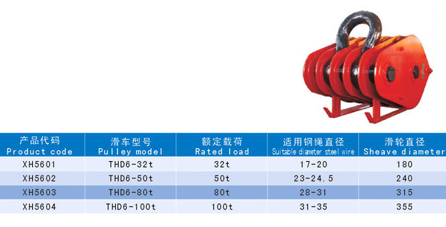 Tackle is divided into single-wheel tackle, double-wheel tackle and multiple –wheel tackle according to wheel number; it is also classified into hook tackle, chain ring tackle, ring tackle and hanging beam tackle according to the connection way between tackle and hanging objects. General speaking, most of small or medium sized tackles fall into hook tackle, chain ring tackle and ring tackle while large sized tackles are usually ring tackle or hanging beam tackle; it is categorized into tackle with sliding bearing mounted between axles and tackle with rolling bearing mounted between axles according to the joint of wheel and axle; it can be divided into opened tackle and closed tackle according to splint. The splint of opened tackle can be opened to facilitate installing cable and most of opened tackles are single wheel tackle which is used as guide tackle at the bottom of standing derrick; it can be divided into fixed tackle and movable tackle according usage way. It is convenient to use tackles which can be widely used in places such as factory, mine, agriculture, electricity power, construction, wharf, dock, machine installation in warehouse and cargo lifting in a manual and mechanical way.
