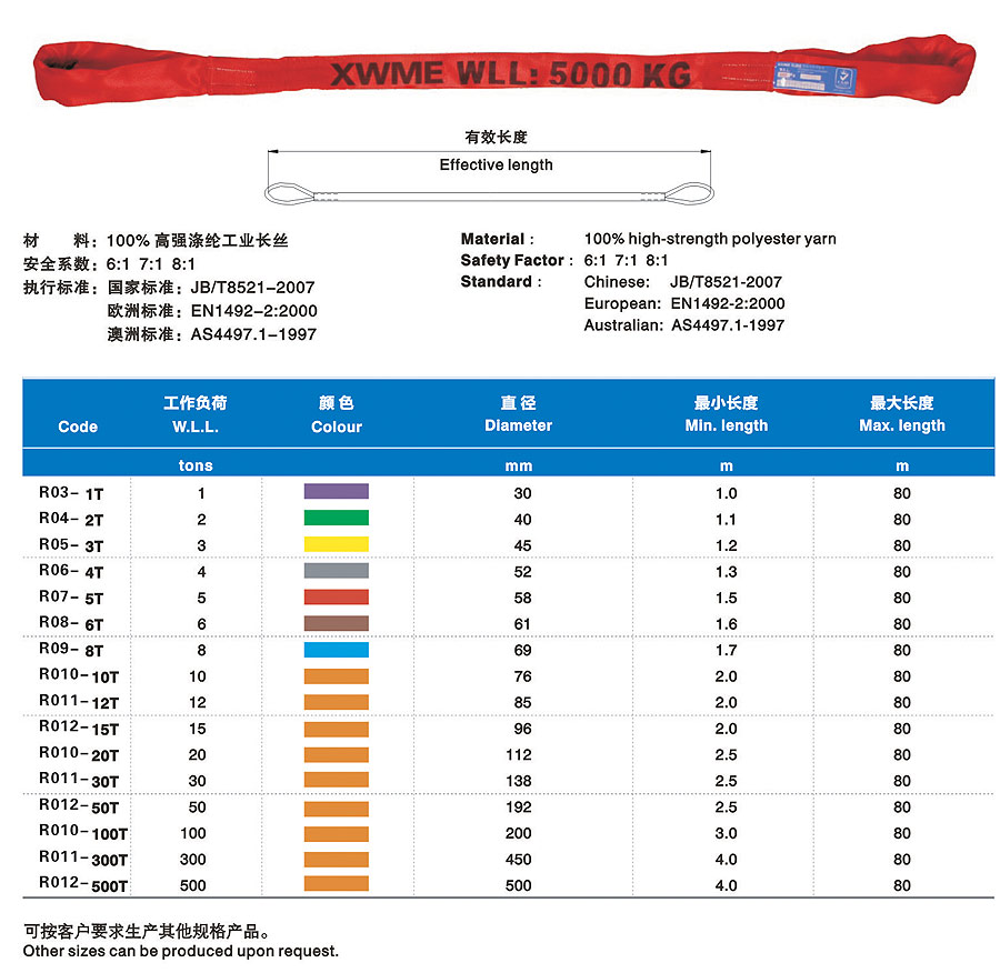 合成纖維吊裝帶(以下簡稱吊裝帶)為軟吊裝帶,采用非金屬原料,屬吊裝行業中鋼繩、鏈條的換代產品,比同類金屬繩相對輕便。能解決實際吊裝過程中大噸位、小吊裝空間的吊裝難題。吊裝帶有輕便、使用壽命長、減震性能好、不導電、不易腐蝕、保護被吊物品不被刮傷等特點。多次的斷裂試驗表明,吊裝帶相對于金屬繩鏈產生的反向傷害幾乎為零。吊裝帶采用國際標準色來區分承載噸位,在使用過程中,吊帶裝上的標簽磨損后,可能過吊裝帶外套的顏色來識別承重重量。合成纖維吊裝帶在國際上起步較早,至今已有著五十多年的應用歷史,在經過二十多年的國內推廣應用,以其獨有的顯著優勢,早許多行業正逐步替代鋼絲繩索具和鏈條索具。