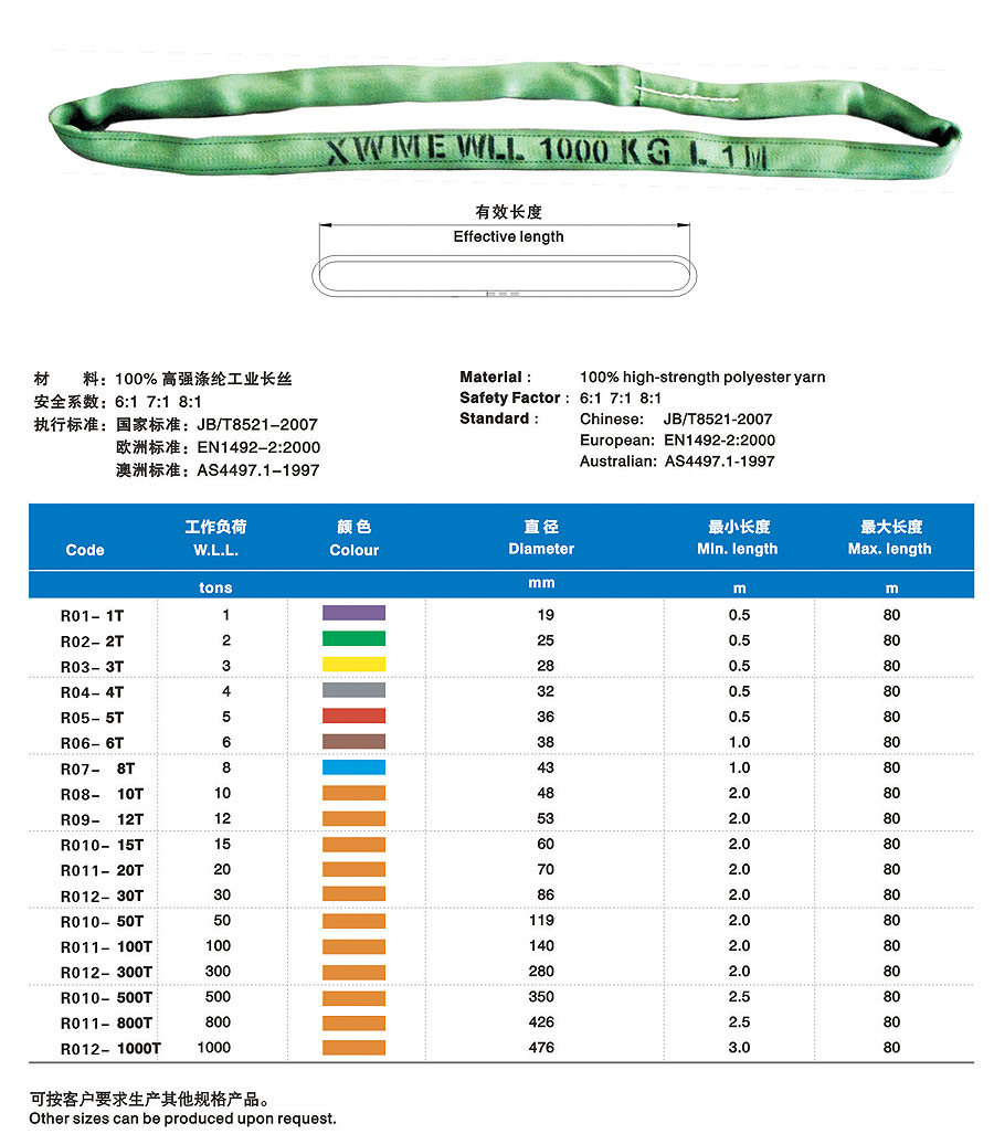 合成纖維吊裝帶(以下簡稱吊裝帶)為軟吊裝帶,采用非金屬原料,屬吊裝行業中鋼繩、鏈條的換代產品,比同類金屬繩相對輕便。能解決實際吊裝過程中大噸位、小吊裝空間的吊裝難題。吊裝帶有輕便、使用壽命長、減震性能好、不導電、不易腐蝕、保護被吊物品不被刮傷等特點。多次的斷裂試驗表明,吊裝帶相對于金屬繩鏈產生的反向傷害幾乎為零。吊裝帶采用國際標準色來區分承載噸位,在使用過程中,吊帶裝上的標簽磨損后,可能過吊裝帶外套的顏色來識別承重重量。合成纖維吊裝帶在國際上起步較早,至今已有著五十多年的應用歷史,在經過二十多年的國內推廣應用,以其獨有的顯著優勢,早許多行業正逐步替代鋼絲繩索具和鏈條索具。