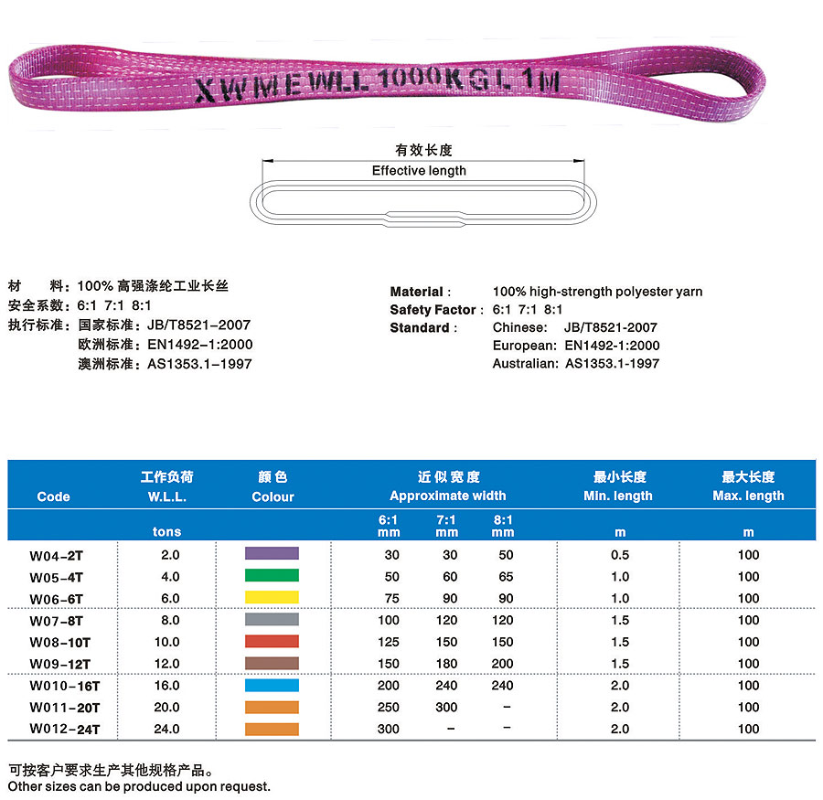 合成纖維吊裝帶(以下簡稱吊裝帶)為軟吊裝帶,采用非金屬原料,屬吊裝行業中鋼繩、鏈條的換代產品,比同類金屬繩相對輕便。能解決實際吊裝過程中大噸位、小吊裝空間的吊裝難題。吊裝帶有輕便、使用壽命長、減震性能好、不導電、不易腐蝕、保護被吊物品不被刮傷等特點。多次的斷裂試驗表明,吊裝帶相對于金屬繩鏈產生的反向傷害幾乎為零。吊裝帶采用國際標準色來區分承載噸位,在使用過程中,吊帶裝上的標簽磨損后,可能過吊裝帶外套的顏色來識別承重重量。合成纖維吊裝帶在國際上起步較早,至今已有著五十多年的應用歷史,在經過二十多年的國內推廣應用,以其獨有的顯著優勢,早許多行業正逐步替代鋼絲繩索具和鏈條索具。