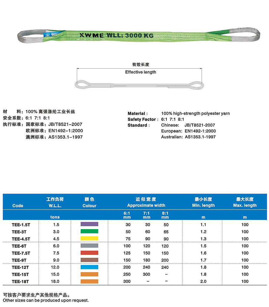 合成纖維吊裝帶(以下簡稱吊裝帶)為軟吊裝帶,采用非金屬原料,屬吊裝行業中鋼繩、鏈條的換代產品,比同類金屬繩相對輕便。能解決實際吊裝過程中大噸位、小吊裝空間的吊裝難題。吊裝帶有輕便、使用壽命長、減震性能好、不導電、不易腐蝕、保護被吊物品不被刮傷等特點。多次的斷裂試驗表明,吊裝帶相對于金屬繩鏈產生的反向傷害幾乎為零。吊裝帶采用國際標準色來區分承載噸位,在使用過程中,吊帶裝上的標簽磨損后,可能過吊裝帶外套的顏色來識別承重重量。合成纖維吊裝帶在國際上起步較早,至今已有著五十多年的應用歷史,在經過二十多年的國內推廣應用,以其獨有的顯著優勢,早許多行業正逐步替代鋼絲繩索具和鏈條索具。