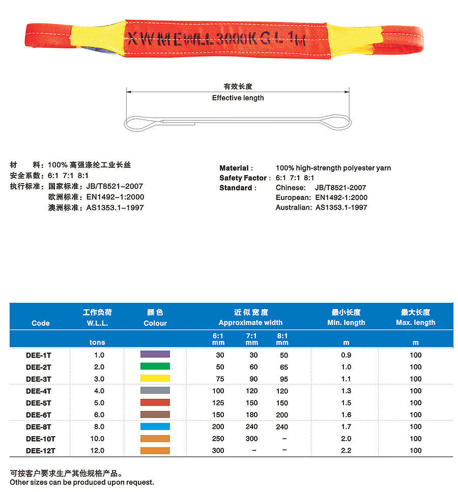 合成纖維吊裝帶(以下簡稱吊裝帶)為軟吊裝帶,采用非金屬原料,屬吊裝行業(yè)中鋼繩、鏈條的換代產(chǎn)品,比同類金屬繩相對輕便。能解決實際吊裝過程中大噸位、小吊裝空間的吊裝難題。吊裝帶有輕便、使用壽命長、減震性能好、不導(dǎo)電、不易腐蝕、保護被吊物品不被刮傷等特點。多次的斷裂試驗表明,吊裝帶相對于金屬繩鏈產(chǎn)生的反向傷害幾乎為零。吊裝帶采用國際標(biāo)準(zhǔn)色來區(qū)分承載噸位,在使用過程中,吊帶裝上的標(biāo)簽?zāi)p后,可能過吊裝帶外套的顏色來識別承重重量。合成纖維吊裝帶在國際上起步較早,至今已有著五十多年的應(yīng)用歷史,在經(jīng)過二十多年的國內(nèi)推廣應(yīng)用,以其獨有的顯著優(yōu)勢,早許多行業(yè)正逐步替代鋼絲繩索具和鏈條索具。