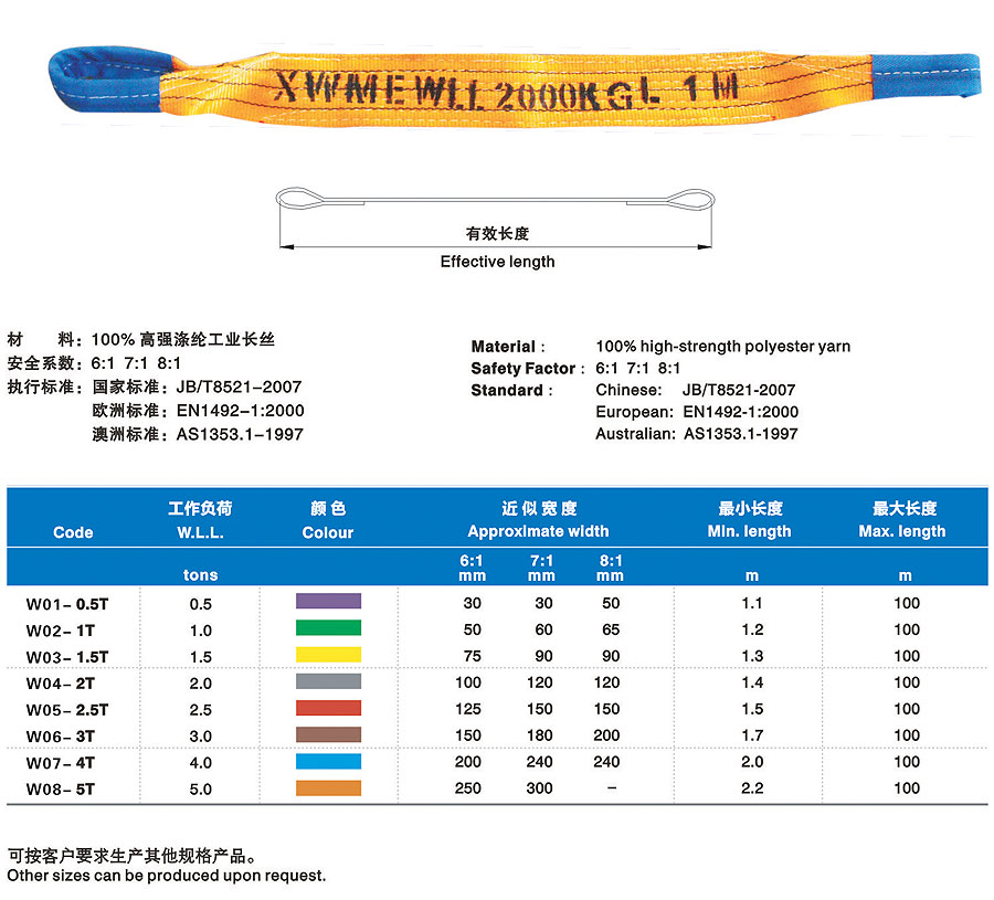 合成纖維吊裝帶(以下簡稱吊裝帶)為軟吊裝帶,采用非金屬原料,屬吊裝行業中鋼繩、鏈條的換代產品,比同類金屬繩相對輕便。能解決實際吊裝過程中大噸位、小吊裝空間的吊裝難題。吊裝帶有輕便、使用壽命長、減震性能好、不導電、不易腐蝕、保護被吊物品不被刮傷等特點。多次的斷裂試驗表明,吊裝帶相對于金屬繩鏈產生的反向傷害幾乎為零。吊裝帶采用國際標準色來區分承載噸位,在使用過程中,吊帶裝上的標簽磨損后,可能過吊裝帶外套的顏色來識別承重重量。合成纖維吊裝帶在國際上起步較早,至今已有著五十多年的應用歷史,在經過二十多年的國內推廣應用,以其獨有的顯著優勢,早許多行業正逐步替代鋼絲繩索具和鏈條索具。