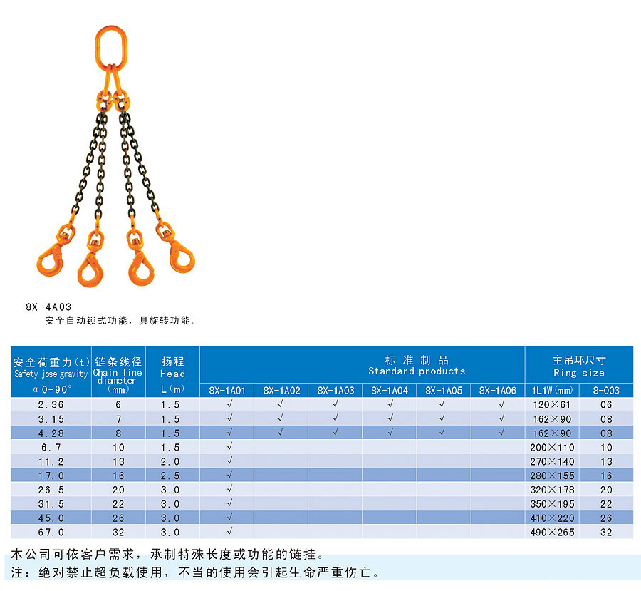 鏈條索具是以金屬鏈環連接而成的索具,按其形式分主要有焊接和組裝兩種,按其構造分有單肢和多肢等,采用的是優質合金鋼,耐磨性好、強度高、使用壽命長、易彎曲。適合大規模、頻繁使用的場合;其還具有耐輻射高溫(-40~228℃)的特點,亦適用于熱鋼胚、卷鋼的吊運。靈活的多肢、多種組合形式,可提高工作效率,降低成本。