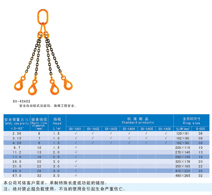 鏈條索具是以金屬鏈環(huán)連接而成的索具,按其形式分主要有焊接和組裝兩種,按其構(gòu)造分有單肢和多肢等,采用的是優(yōu)質(zhì)合金鋼,耐磨性好、強度高、使用壽命長、易彎曲。適合大規(guī)模、頻繁使用的場合;其還具有耐輻射高溫(-40~227℃)的特點,亦適用于熱鋼胚、卷鋼的吊運。靈活的多肢、多種組合形式,可提高工作效率,降低成本。
