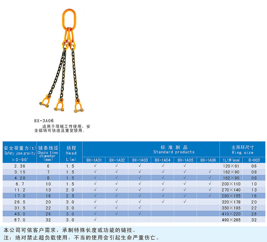 鏈條索具是以金屬鏈環連接而成的索具,按其形式分主要有焊接和組裝兩種,按其構造分有單肢和多肢等,采用的是優質合金鋼,耐磨性好、強度高、使用壽命長、易彎曲。適合大規模、頻繁使用的場合;其還具有耐輻射高溫(-40~225℃)的特點,亦適用于熱鋼胚、卷鋼的吊運。靈活的多肢、多種組合形式,可提高工作效率,降低成本。