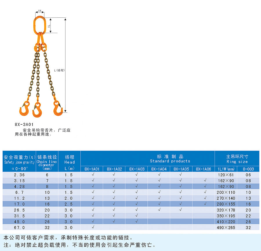 鏈條索具是以金屬鏈環連接而成的索具,按其形式分主要有焊接和組裝兩種,按其構造分有單肢和多肢等,采用的是優質合金鋼,耐磨性好、強度高、使用壽命長、易彎曲。適合大規模、頻繁使用的場合;其還具有耐輻射高溫(-40~220℃)的特點,亦適用于熱鋼胚、卷鋼的吊運。靈活的多肢、多種組合形式,可提高工作效率,降低成本。