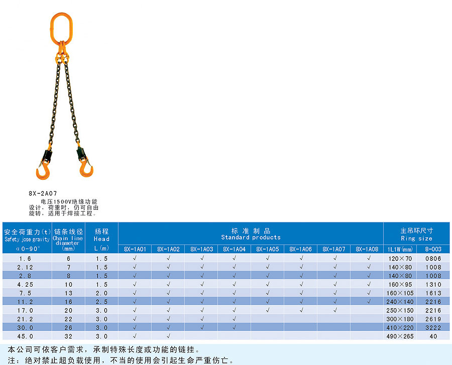 鏈條索具是以金屬鏈環連接而成的索具,按其形式分主要有焊接和組裝兩種,按其構造分有單肢和多肢等,采用的是優質合金鋼,耐磨性好、強度高、使用壽命長、易彎曲。適合大規模、頻繁使用的場合;其還具有耐輻射高溫(-40~218℃)的特點,亦適用于熱鋼胚、卷鋼的吊運。靈活的多肢、多種組合形式,可提高工作效率,降低成本。