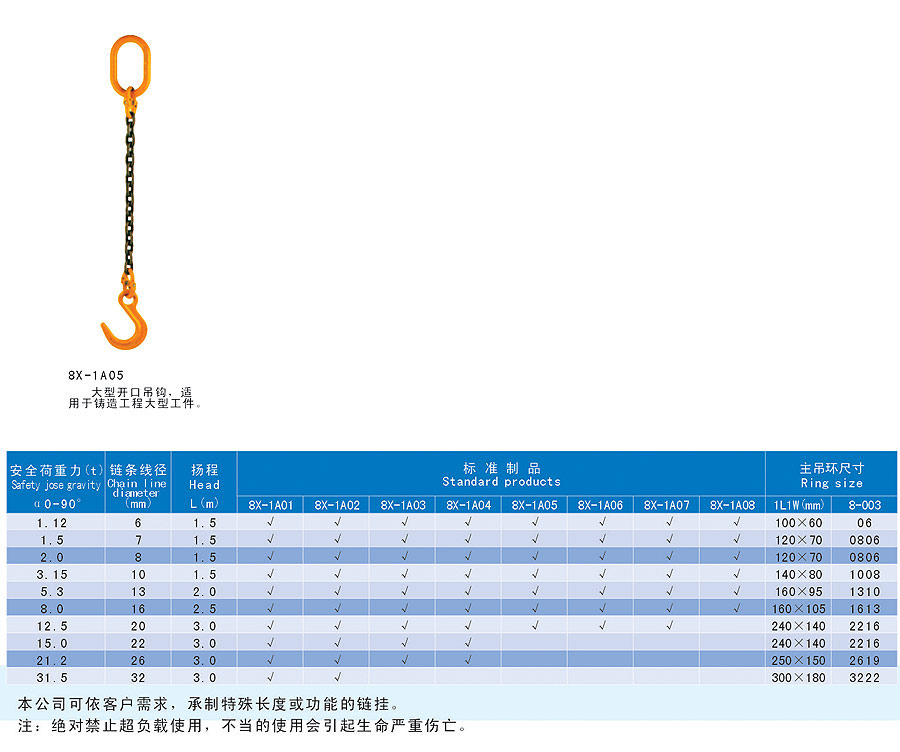 鏈條索具是以金屬鏈環連接而成的索具,按其形式分主要有焊接和組裝兩種,按其構造分有單肢和多肢等,采用的是優質合金鋼,耐磨性好、強度高、使用壽命長、易彎曲。適合大規模、頻繁使用的場合;其還具有耐輻射高溫(-40~208℃)的特點,亦適用于熱鋼胚、卷鋼的吊運。靈活的多肢、多種組合形式,可提高工作效率,降低成本。