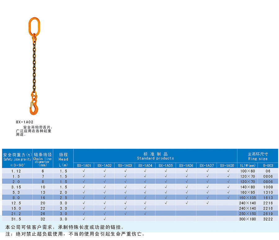 鏈條索具是以金屬鏈環(huán)連接而成的索具,按其形式分主要有焊接和組裝兩種,按其構造分有單肢和多肢等,采用的是優(yōu)質合金鋼,耐磨性好、強度高、使用壽命長、易彎曲。適合大規(guī)模、頻繁使用的場合;其還具有耐輻射高溫(-40~205℃)的特點,亦適用于熱鋼胚、卷鋼的吊運。靈活的多肢、多種組合形式,可提高工作效率,降低成本。