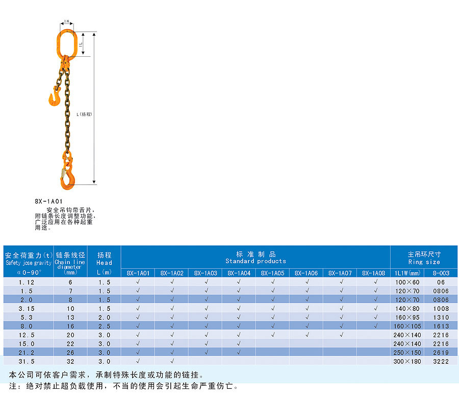 鏈條索具是以金屬鏈環連接而成的索具,按其形式分主要有焊接和組裝兩種,按其構造分有單肢和多肢等,采用的是優質合金鋼,耐磨性好、強度高、使用壽命長、易彎曲。適合大規模、頻繁使用的場合;其還具有耐輻射高溫(-40~204℃)的特點,亦適用于熱鋼胚、卷鋼的吊運。靈活的多肢、多種組合形式,可提高工作效率,降低成本。