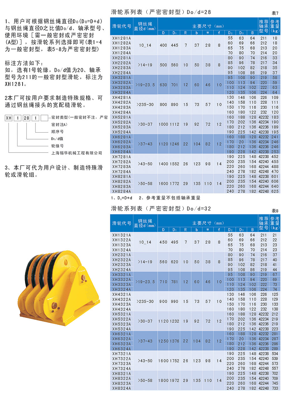 滑車按輪數(shù)的多少分為單門滑車,雙門滑車和多門滑車。按滑車與吊物的連接方式可分為吊鉤式滑車,鏈環(huán)式滑車,吊環(huán)式滑車和吊架式滑車四種。一般中小型的滑車多司于吊鉤式、鏈環(huán)式和吊環(huán)式,而大型滑車采用吊環(huán)式和吊梁式。按輪和軸的接觸不同可分為輪軸間裝滑動軸承及滾動軸承兩種。按夾板是否可以打開來分,有開口滑車和閉口滑車。開口滑車的夾板是可以打開的,便于裝繩索,一般的都是單門滑車,它常用于扒桿底腳處作導向滑車用。滑車按使用的方式不同又分為定滑車和動滑車。使用方便,用途廣泛,可以手動,機動。主要用于工廠、礦山、農(nóng)業(yè)、電力、建筑的生產(chǎn)施工,碼頭、船塢、倉庫的機器安裝,貨物起吊等。