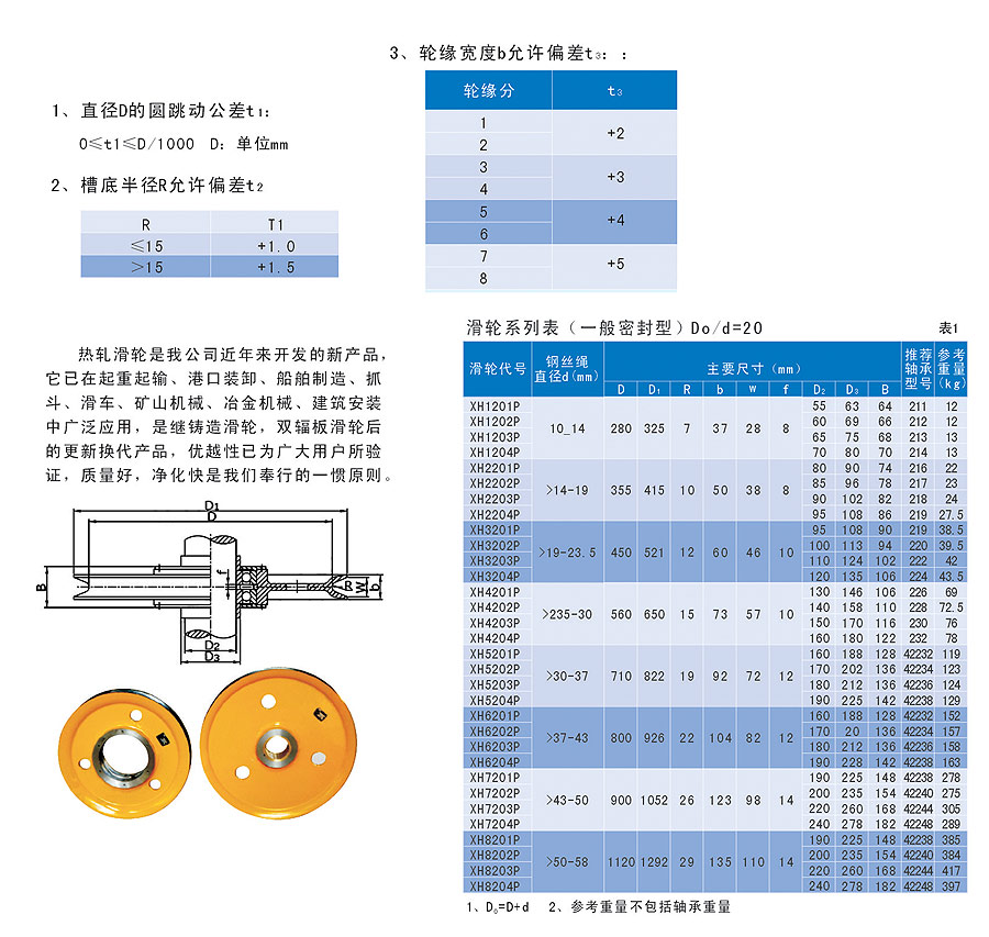 滑車按輪數(shù)的多少分為單門滑車,雙門滑車和多門滑車。按滑車與吊物的連接方式可分為吊鉤式滑車,鏈環(huán)式滑車,吊環(huán)式滑車和吊架式滑車四種。一般中小型的滑車多司于吊鉤式、鏈環(huán)式和吊環(huán)式,而大型滑車采用吊環(huán)式和吊梁式。按輪和軸的接觸不同可分為輪軸間裝滑動(dòng)軸承及滾動(dòng)軸承兩種。按夾板是否可以打開(kāi)來(lái)分,有開(kāi)口滑車和閉口滑車。開(kāi)口滑車的夾板是可以打開(kāi)的,便于裝繩索,一般的都是單門滑車,它常用于扒桿底腳處作導(dǎo)向滑車用?;嚢词褂玫姆绞讲煌址譃槎ɑ嚭蛣?dòng)滑車。使用方便,用途廣泛,可以手動(dòng),機(jī)動(dòng)。主要用于工廠、礦山、農(nóng)業(yè)、電力、建筑的生產(chǎn)施工,碼頭、船塢、倉(cāng)庫(kù)的機(jī)器安裝,貨物起吊等。