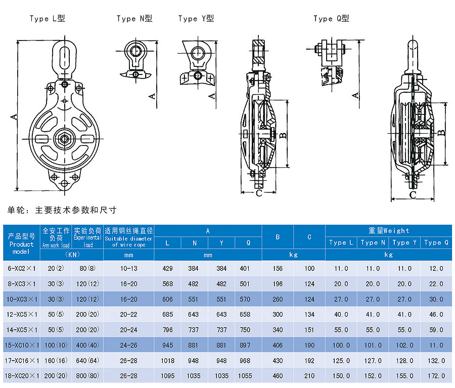 滑車按輪數(shù)的多少分為單門滑車,雙門滑車和多門滑車。按滑車與吊物的連接方式可分為吊鉤式滑車,鏈環(huán)式滑車,吊環(huán)式滑車和吊架式滑車四種。一般中小型的滑車多司于吊鉤式、鏈環(huán)式和吊環(huán)式,而大型滑車采用吊環(huán)式和吊梁式。按輪和軸的接觸不同可分為輪軸間裝滑動軸承及滾動軸承兩種。按夾板是否可以打開來分,有開口滑車和閉口滑車。開口滑車的夾板是可以打開的,便于裝繩索,一般的都是單門滑車,它常用于扒桿底腳處作導(dǎo)向滑車用。滑車按使用的方式不同又分為定滑車和動滑車。使用方便,用途廣泛,可以手動,機(jī)動。主要用于工廠、礦山、農(nóng)業(yè)、電力、建筑的生產(chǎn)施工,碼頭、船塢、倉庫的機(jī)器安裝,貨物起吊等。