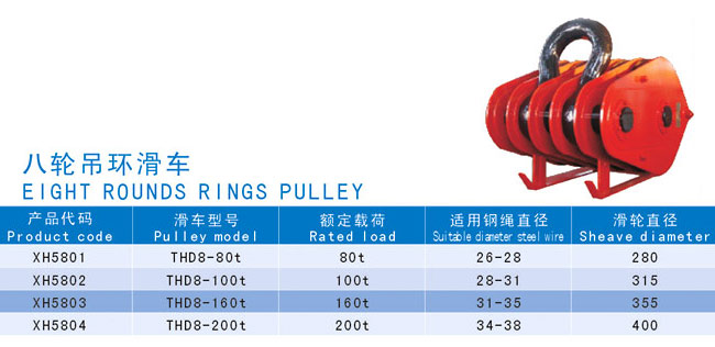 滑車按輪數的多少分為單門滑車,雙門滑車和多門滑車。按滑車與吊物的連接方式可分為吊鉤式滑車,鏈環式滑車,吊環式滑車和吊架式滑車四種。一般中小型的滑車多司于吊鉤式、鏈環式和吊環式,而大型滑車采用吊環式和吊梁式。按輪和軸的接觸不同可分為輪軸間裝滑動軸承及滾動軸承兩種。按夾板是否可以打開來分,有開口滑車和閉口滑車。開口滑車的夾板是可以打開的,便于裝繩索,一般的都是單門滑車,它常用于扒桿底腳處作導向滑車用。滑車按使用的方式不同又分為定滑車和動滑車。使用方便,用途廣泛,可以手動,機動。主要用于工廠、礦山、農業、電力、建筑的生產施工,碼頭、船塢、倉庫的機器安裝,貨物起吊等。
