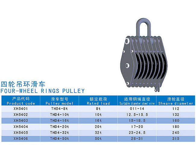 滑車按輪數的多少分為單門滑車,雙門滑車和多門滑車。按滑車與吊物的連接方式可分為吊鉤式滑車,鏈環式滑車,吊環式滑車和吊架式滑車四種。一般中小型的滑車多司于吊鉤式、鏈環式和吊環式,而大型滑車采用吊環式和吊梁式。按輪和軸的接觸不同可分為輪軸間裝滑動軸承及滾動軸承兩種。按夾板是否可以打開來分,有開口滑車和閉口滑車。開口滑車的夾板是可以打開的,便于裝繩索,一般的都是單門滑車,它常用于扒桿底腳處作導向滑車用。滑車按使用的方式不同又分為定滑車和動滑車。使用方便,用途廣泛,可以手動,機動。主要用于工廠、礦山、農業、電力、建筑的生產施工,碼頭、船塢、倉庫的機器安裝,貨物起吊等。