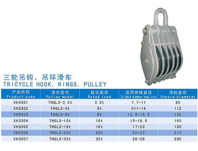 滑車按輪數的多少分為單門滑車,雙門滑車和多門滑車。按滑車與吊物的連接方式可分為吊鉤式滑車,鏈環式滑車,吊環式滑車和吊架式滑車四種。一般中小型的滑車多司于吊鉤式、鏈環式和吊環式,而大型滑車采用吊環式和吊梁式。按輪和軸的接觸不同可分為輪軸間裝滑動軸承及滾動軸承兩種。按夾板是否可以打開來分,有開口滑車和閉口滑車。開口滑車的夾板是可以打開的,便于裝繩索,一般的都是單門滑車,它常用于扒桿底腳處作導向滑車用。滑車按使用的方式不同又分為定滑車和動滑車。使用方便,用途廣泛,可以手動,機動。主要用于工廠、礦山、農業、電力、建筑的生產施工,碼頭、船塢、倉庫的機器安裝,貨物起吊等。